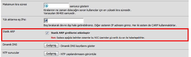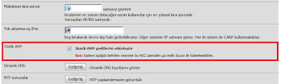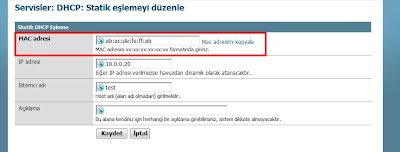 DHCP Statik Eşleme: Belirlenen MAC adresine DHCP tarafından aynı ip adresinin atanmasını sağlamak için tanımlanmalıdır. Filtreleme ve benzeri işlemlerde yönetimi kolaylaştırmak yada internet erişimini sadece tanımlı IP/MAC e sahip bilgisayarlara sağlamak için kullanılabilir.