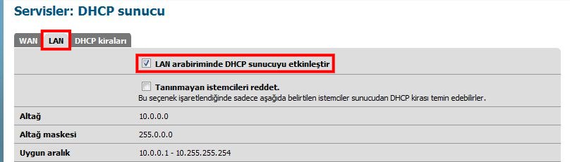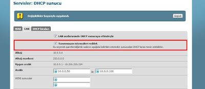 DHCP Sunucu yapılandırılmasının sağlandığı sayfada " Tanımlanmayan istemcileri reddet " seçeneği ile sadece rezerve edilmiş bilgisayarların ip adresi alması sağlanabilir.