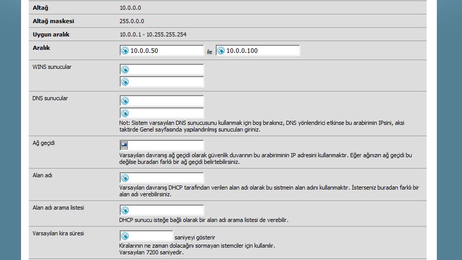 Yukarıdaki örnekte " LAN " ara birimi üzerinde DHCP servisi aktif edilmiştir. Alt Ağ, Alt Ağ maskesi ve Uygun Aralık bölümleri ara biriminin IP adresine göre sistem tarafından tanımlanmaktadır.