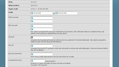 Dağıtılacak IP adresi bloğunu "Aralık" bölümünden belirtebilirsiniz.DNS ve Ağ geçidi tanımları eğer boş olarak geçilir ise Coslat tanımlara kendi IP adresini yapılandıracaktır.