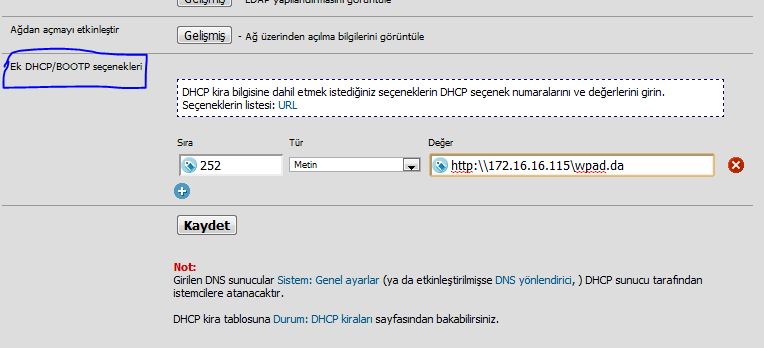 Wpad yapılandırması ile kullanıcıların Proxy bilgisini otomatik olarak almasını sağlayabilirsiniz ve kullanıcılara el ile Proxy tanımlaması yapmaktan kurtulabilirsiniz. Web tarayıcınız kullanacağı Proxy bilgisini Wpad.da dosyasından okuyacaktır ve bu dosyanın yolu bilgisayarlara DHCP'den gönderilecektir.