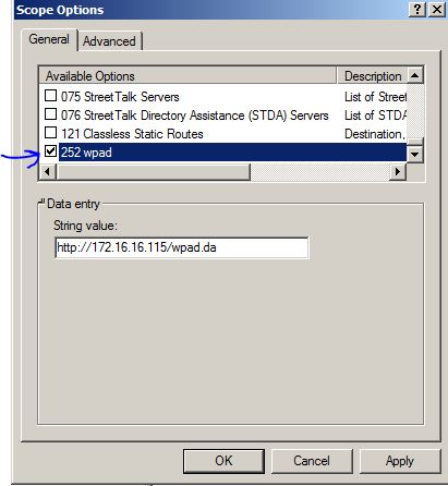 General sekmesi altında Available Options seçeneklerinden üstte eklemiş olduğumuz 252 wpad seçeneği çek işareti ile eklenir.