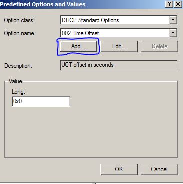 DHCP Standart Options sınıfına Add butonu ile yeni bir seçenek eklenir.