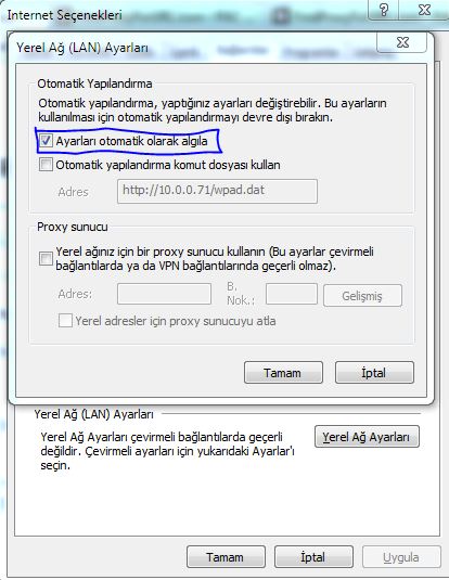 Araçlar -> İnternet Seçenekleri -> Bağlantılar -> Yerel Ağ Ayarları -> Ayarları Otomatik algıla seçeneğinin işaretli olması gerekmektedir.