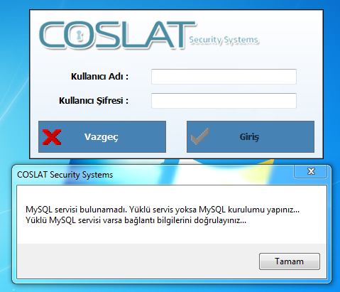 Kurulum sonrası masaüstünde " Coslat Security Systems " adlı oluşturulan klasöre tıklayarak giriş yapılabilir. eğer sistemde " Mysql " kurulu değil ise yada uygulama " Mysql " e bağlantı kuramıyor ise aşağıda görüntülenen uyarı mesajı alınacaktır.