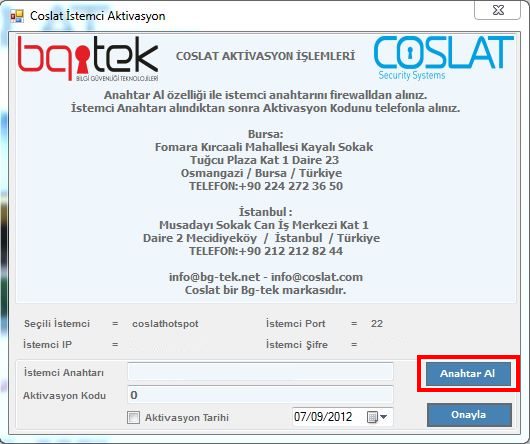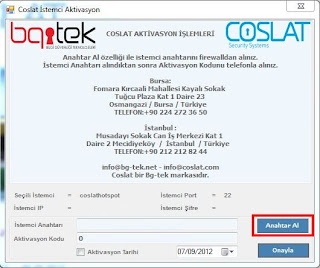 "Aktifle" butonu ile açılan pencereden " Anahtar Al " seçilerek raporlama yapılacak sisteme özel anahtarın oluşturulması sağlanır. Bu aşamada Coslat Monitor uygulamasının kurulacağı sistemin anahtarın oluşturulabilmesi için internete ulaşabilmesi gerekmektedir.