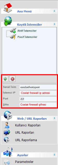 Raporlama uygulaması SSH protokolü ile güvenli olarak rapor aktarımı sağlamaktadır. Varsayılan Port "22" dir. Şifre ise Coslat Web ara yüzü şifresi girilerek tanımlanmalıdır..